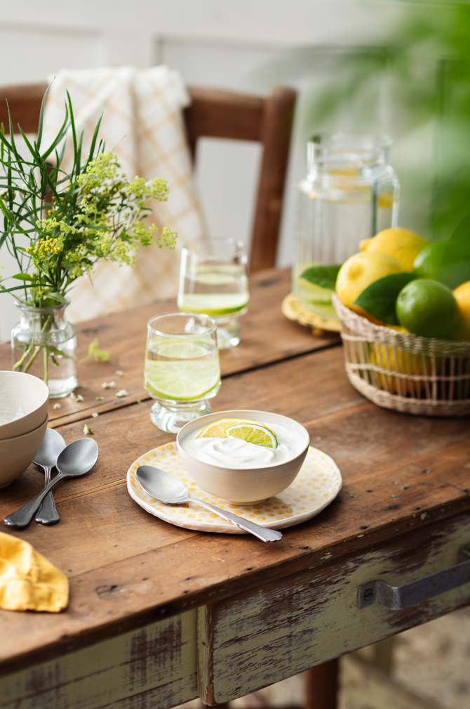 Bol de Fromage Frais Citron et Citron vert Isigny Sainte-Mère sur une table de déjeuner