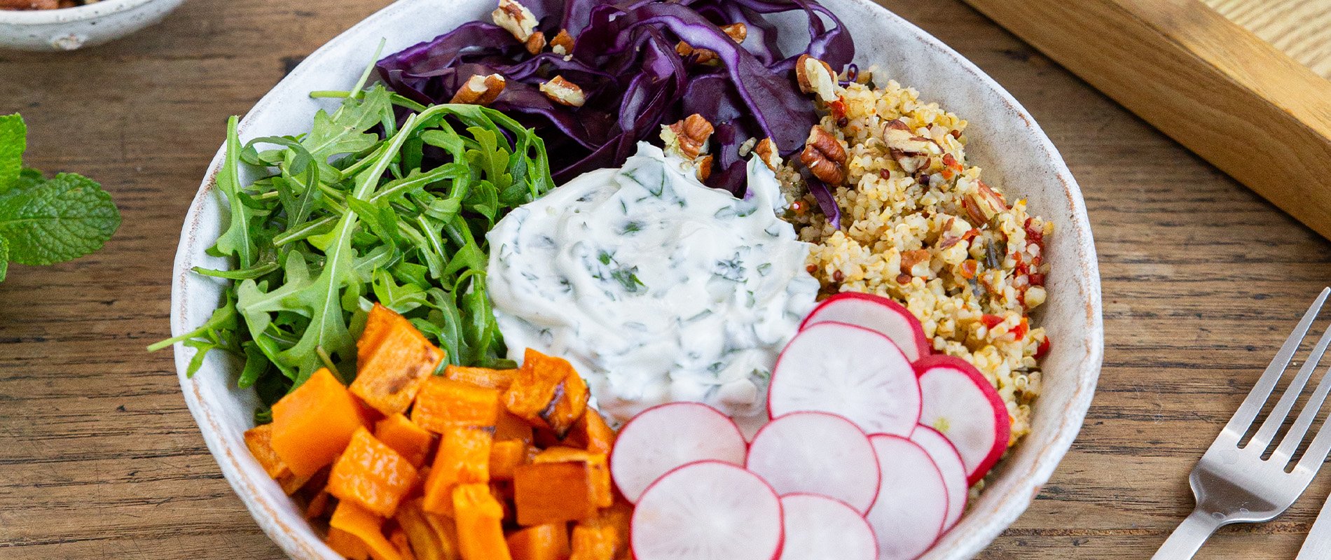 Ajouter harmonieusement la roquette, le chou rouge, la patate douce rôtie et les radis.